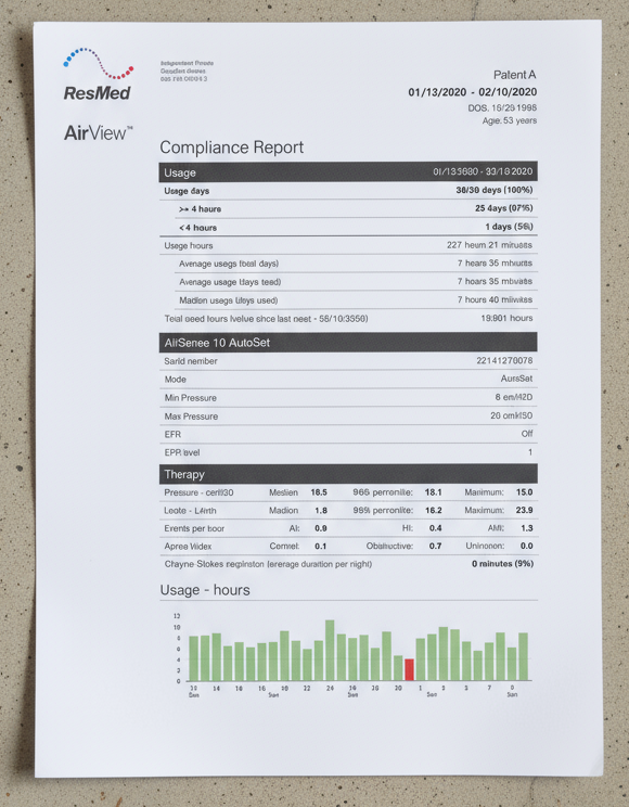 Datos completos de presión óptima, índice de apnea-hipopnea, análisis de fugas, cumplimiento de uso y recomendaciones personalizadas para tu médico tratante.